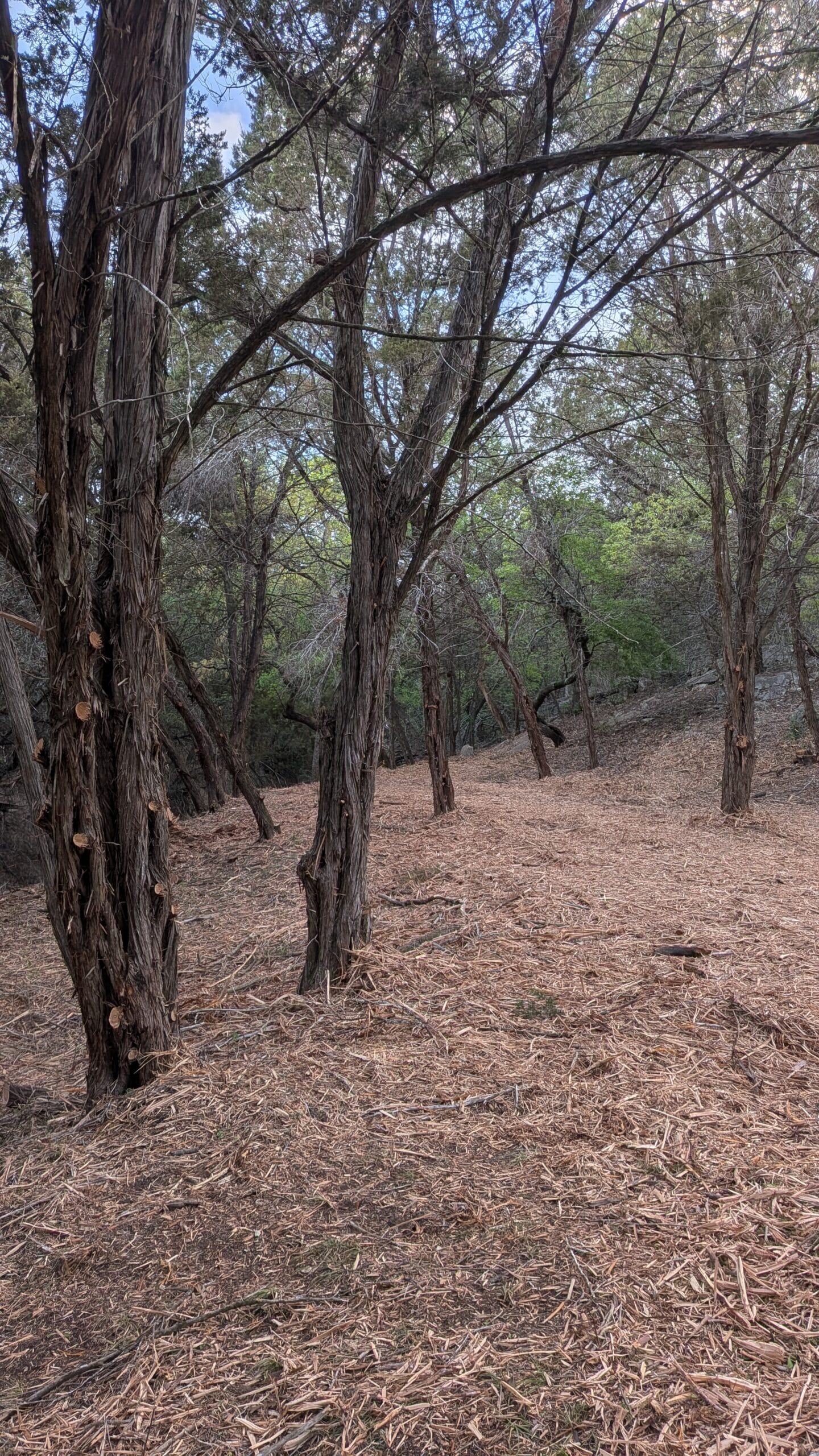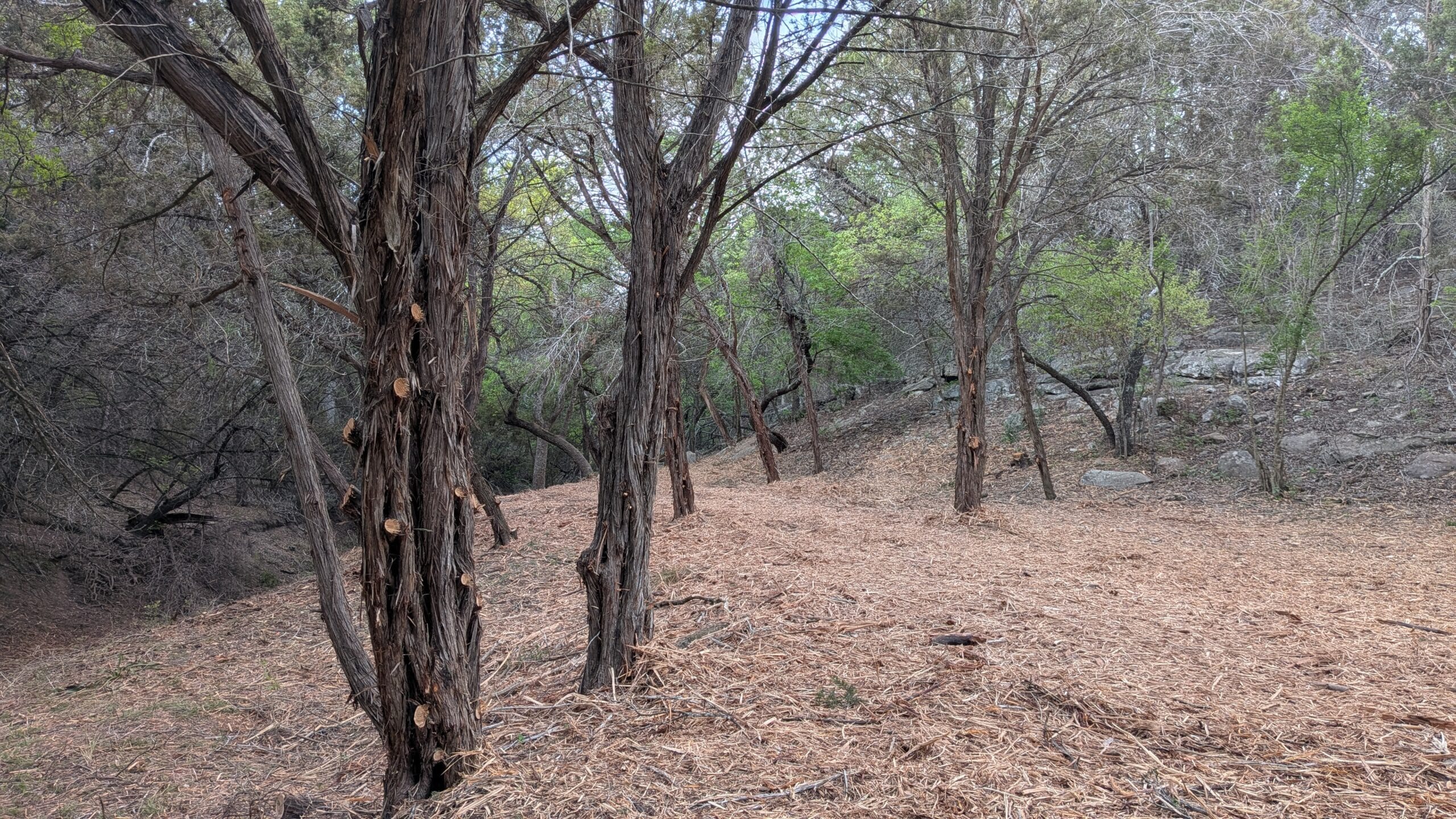 My husband and I own 5 acres of land, that has over the last 10 years shown the ravages of drought and Ice Storms to the point that I felt it could be a wild fire hazard. The land was over loaded with standing deadwood, downed trees and cedar undergrowth.